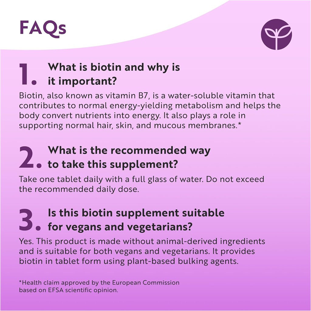 - يحتوي القرص الواحد على 12000 ميكج من البيوتين، مع دعم إضافي من الزنك، السيلينيوم، والنحاس