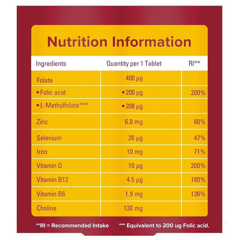 - مكمل غذائي، مع 400 مكجرام حمض الفوليك بالإضافة إلى الحديد وفيتامين د